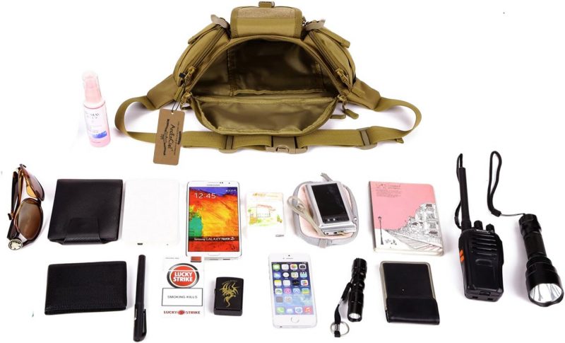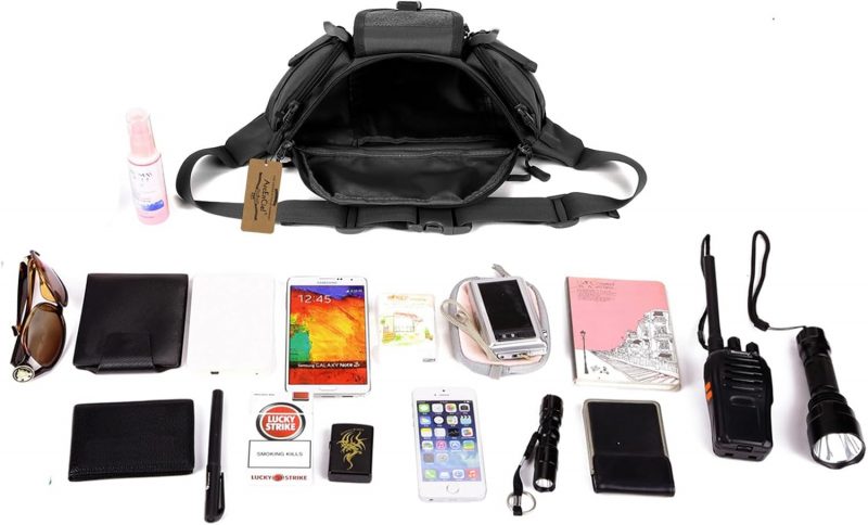 • LARGE MAIN COMPARTMENT is big enough for carrying your ipad mini, cell phone, MP3, glasses, tactical flashlight, compass, kettle, cigarette, snacks, umbrella etc. The zippered BACK POCKET is hidden for extra protection about your passport, ID card, Credit card, wallet and essential stuffs. 3 Front pockets can be used to save your gadgets, small parts