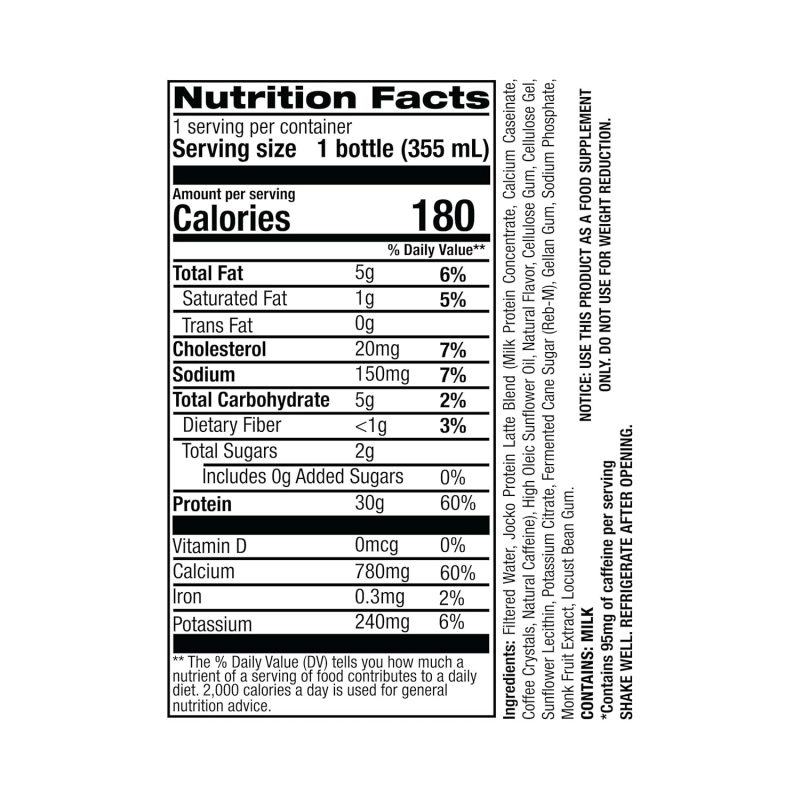 Filtered Water, Jocko Protein Latte Blend (Milk Protein Concentrate, Calcium Caseinate, Coffee Crystals, Natural Caffeine), High Oleic Sunflower Oil, Natural Flavor, Cellulose Gum, Cellulose Gel, Sunflower Lecithin, Potassium Citrate, Fermented Cane Sugar (Reb-M), Gellan Gum, Sodium Phosphate, Monk Fruit Extract, Locust Bean Gum.