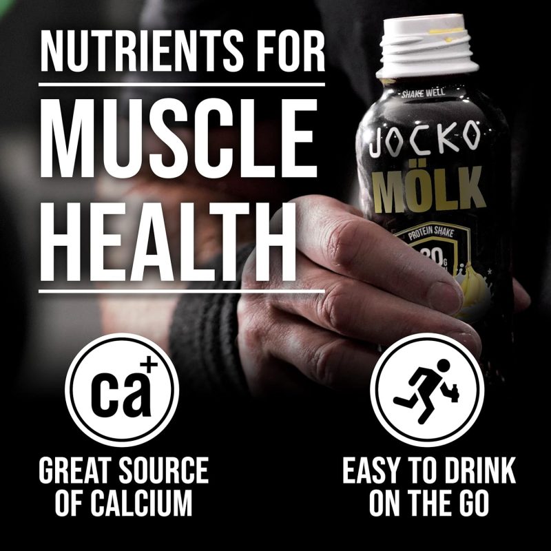 • JOCKO MÖLK ready to drink protein shakes designed and engineered with a protein blend of milk protein concentrate and calcium caseinate. This protein blend helps fuel muscle growth and recovery all day long.