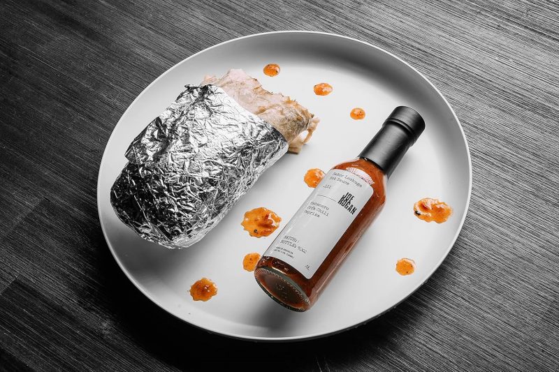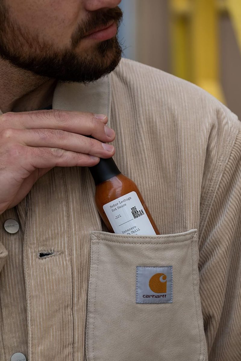 A: We were first connected with Joe right after he tasted and loved our .5326 hot sauce (a collaboration with Half Face Blades). In crafting the custom sauces, Joe tested our full lineup to start. We talked through flavors and heat levels. We talked specific ingredients. (Our goal was to source rare, unique, ultra-premium ingredients to differentiate the collection.) Joe tested samples with different flavors and varying heat levels. We tweaked recipes. And Joe picked the final custom sauces. On the creative side, we presented ideas for custom sauce names, fonts, labels, graphic treatments, images, copy… and from what we presented, Joe selected and approved what he liked best. Joe was involved at each step beyond standing behind the collection by putting his name on it.