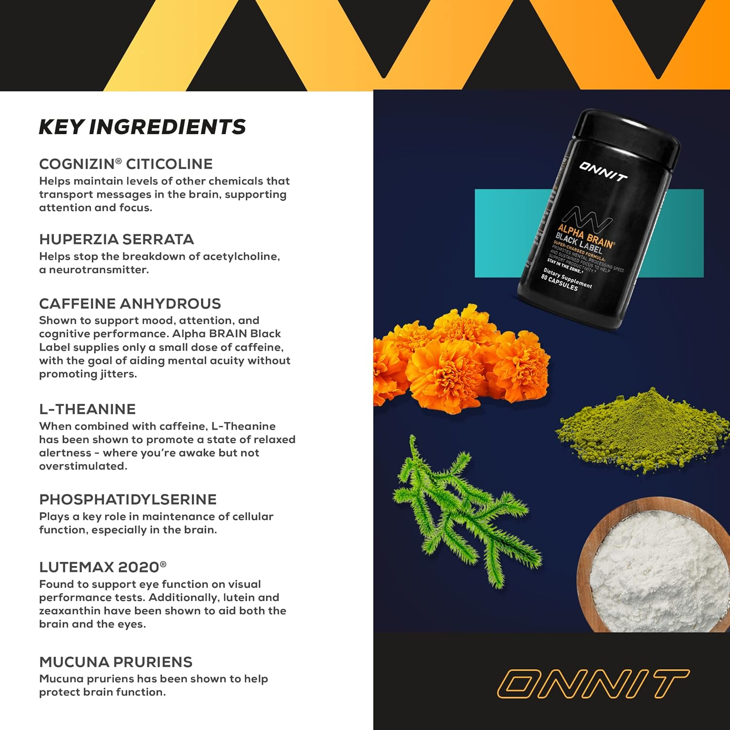 • Promotes Cognitive Support: Experience mental clarity, focus, and concentration with Onnit’s Alpha Brain Black Label nootropic. This premium formula is designed to support cognitive function, providing you with the mental edge you need to excel in work, study, or any mentally demanding task.