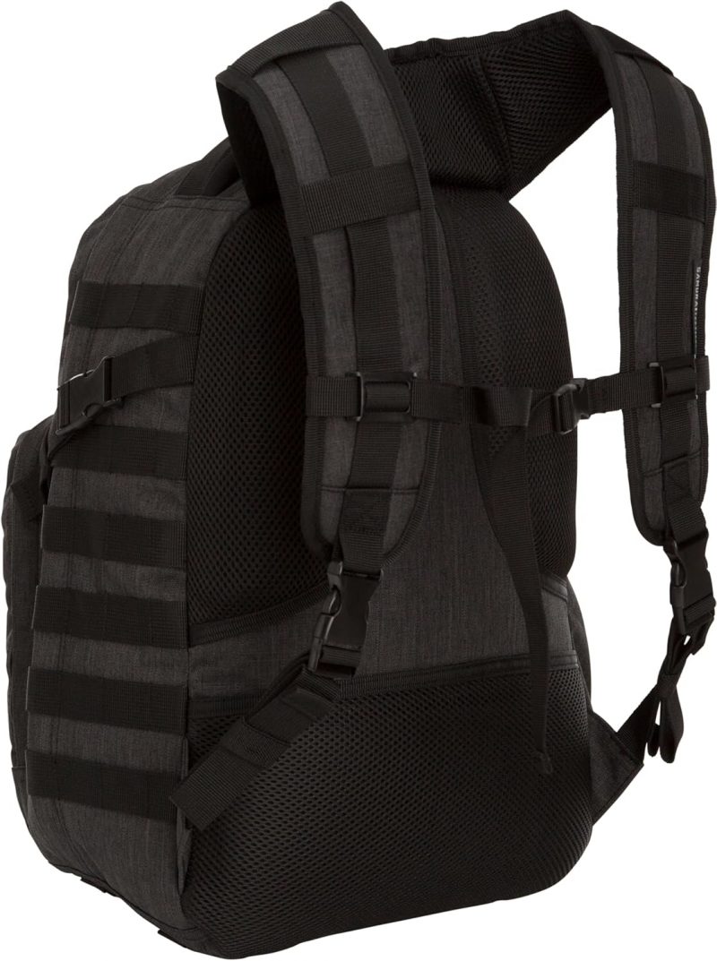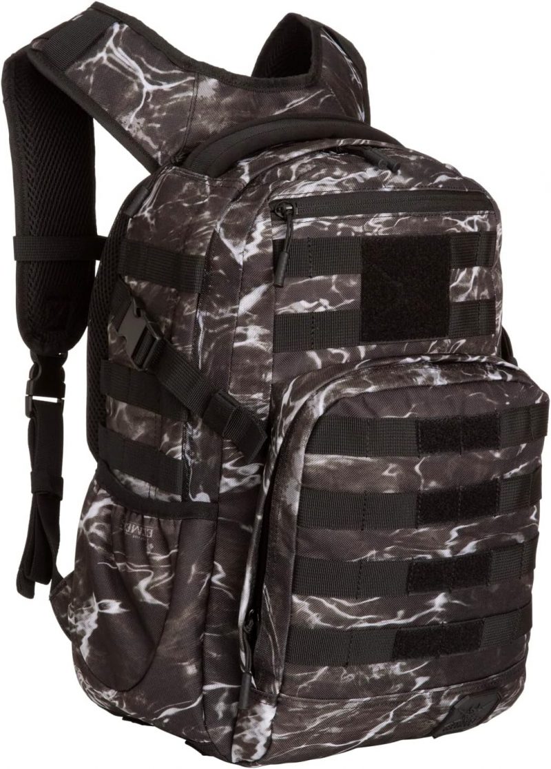 Whether hiking or commuting to school, the SOG Ninja Daypack keeps you organized for any adventure with a variety of compartments, MOLLE webbing for attaching accessories, and hydration pack access. This 24.2-liter tactical backpack features a large main compartment, front accessory pocket with organizer, a small accessory pocket for flat item storage, and a soft-lined pocket at the top for eyeglasses and electronic devices. You’ll be able to quench your thirst wherever you roam with a hydration bladder pocket featuring a tubing port for easy access to H2O (hydration reservoir sold separately; fits up to 2-liter bladder) and a stretchy side pouch that fits most water bottles (sold separately). When you need to carry more gear, the Ninja Daypack has you covered with side compression straps, bottom lashing loops, and heavy-duty MOLLE webbing for attaching a variety of optional pouches, accessories, and modular tactical gear. The military-style Ninja Daypack sits comfortably on your shoulders thanks to the yoke-style adjustable, padded shoulder straps, which feature an adjustable sternum slider for added security and comfort. The breathable padded mesh back keeps you comfortable over long hauls. Other features include durable water repellent construction, a hook-and-loop patch on the front for added customization, top carry handle, durable plastic buckles and zippers, four points for attaching a sleeping bag or roll, and dual bottom grommet drainage holes to help keep water from pooling around your gear.