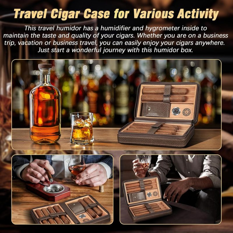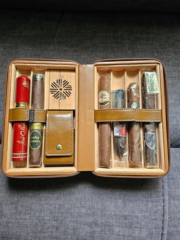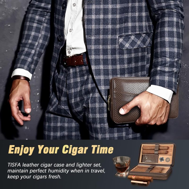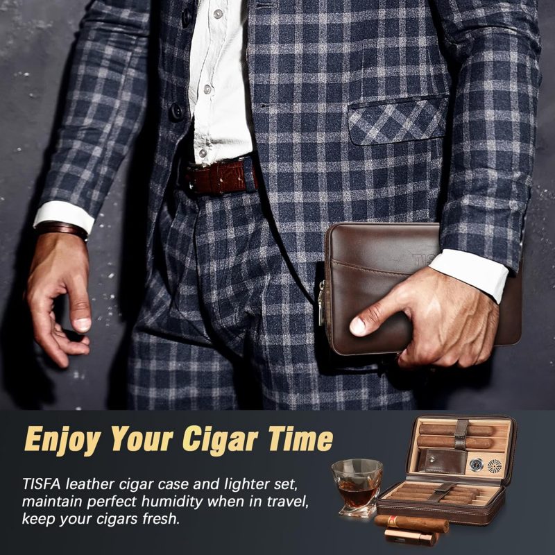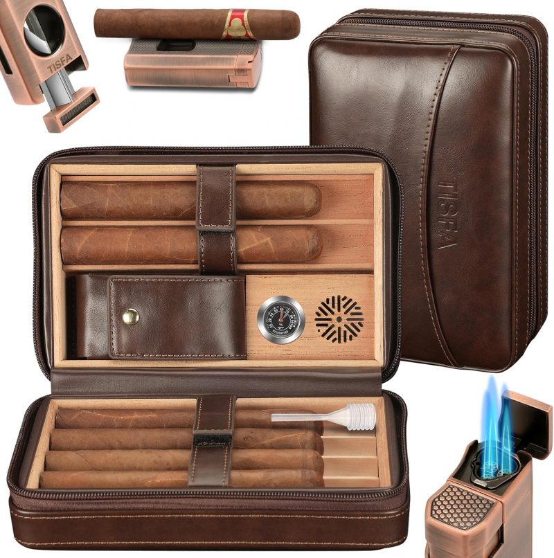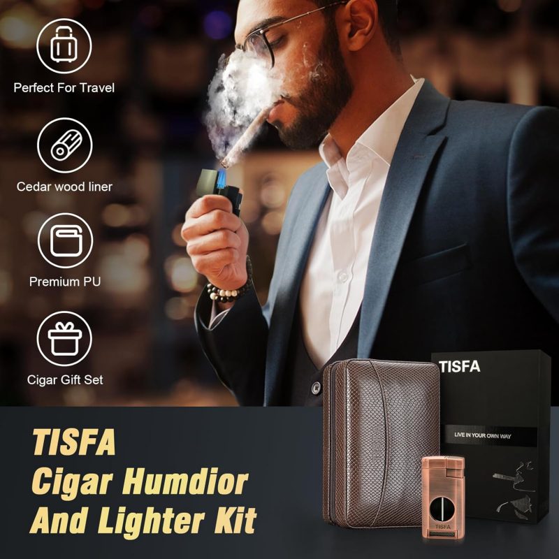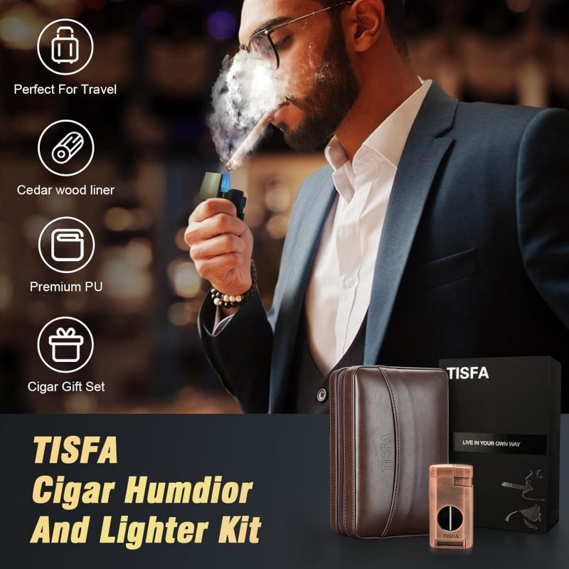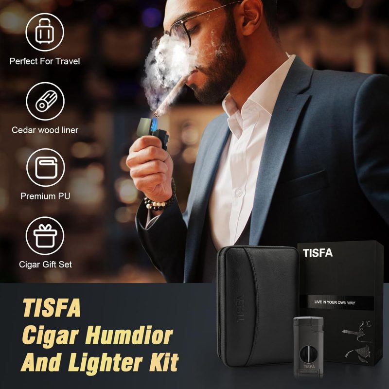 Review: TISFA Cigar Humidor – Leather Cedar Wood Portable CaseThe TISFA Cigar Humidor stands out as a sleek, travel-friendly option for cigar enthusiasts. With a stylish brown leather exterior and cedar wood interior, it combines functionality with aesthetics to keep cigars fresh and well-protected.Key Features: 1. Quality DesignThe leather exterior feels durable and sophisticated, while the cedar lining maintains cigars’ aroma and moisture, enhancing the aging process. 2. 3-in-1 ConvenienceThis set includes a lighter, a V-cut cigar cutter, and a cigar holder, making it a one-stop kit for travel. All accessories fit neatly within the case, so nothing gets left behind. 3. Portable and PracticalCompact enough to carry in a bag but spacious enough for 2-3 cigars, this humidor is perfect for quick trips or gatherings. The built-in humidifier helps regulate moisture, though it may need occasional refills, depending on your location’s climate.Pros: • Elegant leather and cedar design • Convenient all-in-one accessories • Compact, easy to carryCons: • Humidity control may require monitoring • Limited capacity (holds 2-3 cigars)VerdictThe TISFA Leather Cedar Wood Cigar Case is a great travel humidor for those who value style and portability. With its quality construction and convenient accessories, it’s a reliable companion for cigar aficionados on the go.