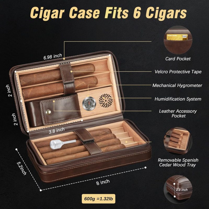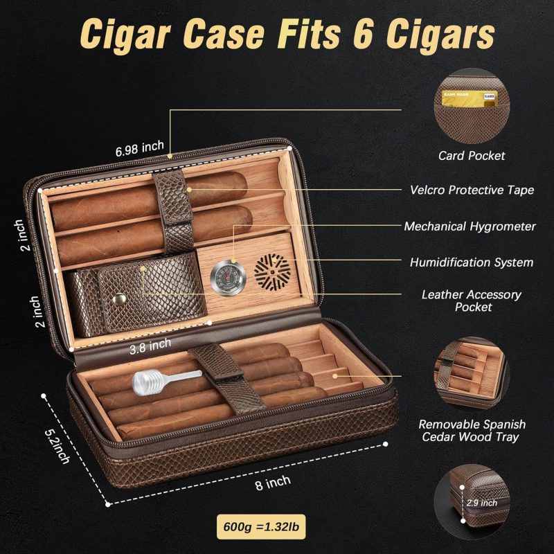 I recently purchased a cigar humidor case, and it has met all of my expectations. From the build quality to its functionality, this humidor has been a solid investment for any cigar enthusiast.Build Quality: The first thing I noticed was the craftsmanship. The exterior has a smooth, polished finish that gives the humidor a refined feel. The wood grain is nice, and the case is well-built, ensuring it will last for years. The hinges and latch are secure, providing a tight seal when closed, which is essential for maintaining the right environment for my cigars.Humidity Control: Inside, the humidor is lined with Spanish cedar, which helps enhance the flavor of the cigars over time. The hygrometer and humidification system work well. After seasoning the humidor, it has consistently kept humidity levels between 65% and 70%, keeping my cigars fresh.Storage Capacity: The size of this case is ideal for my needs. It holds 6 cigars comfortably, and the cedar trays are easy to remove and keeps the cigars secure while transporting.Design: Aesthetically, this humidor is a nice addition to any room. Whether placed on a shelf, desk, or bar, it fits well and adds a touch of class. It’s not only functional but also a good conversation starter for cigar lovers.