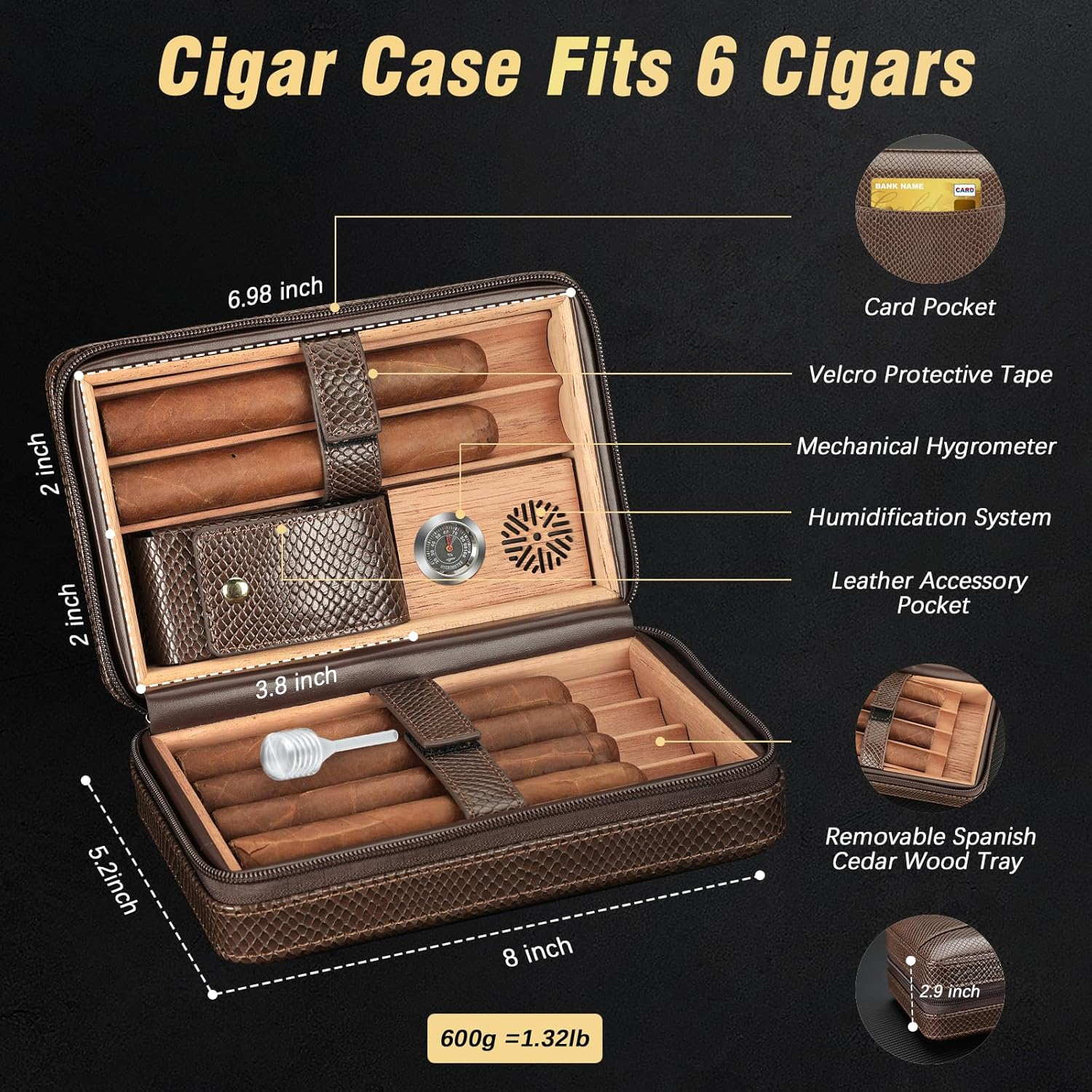 • [EXCELLENT TRAVEL HUMIDOR]: Features 2 DETACHABLE CEDAR WOOD TRAYS, can holding 6 cigars in this cigar box, with a 1 in tray diameter that fit for most ring gauge cigars. The interior on both sides is fitted with LEATHER STRAPS to protect cigars from damage. The LEATHER POCKET can hold equipped cigar lighter or other necessary cigar accessories.The exterior of the humidor includes a CARD SLOT for carrying humidity packs you needs when you’re on the go, it is a practical and convenient cigar case
